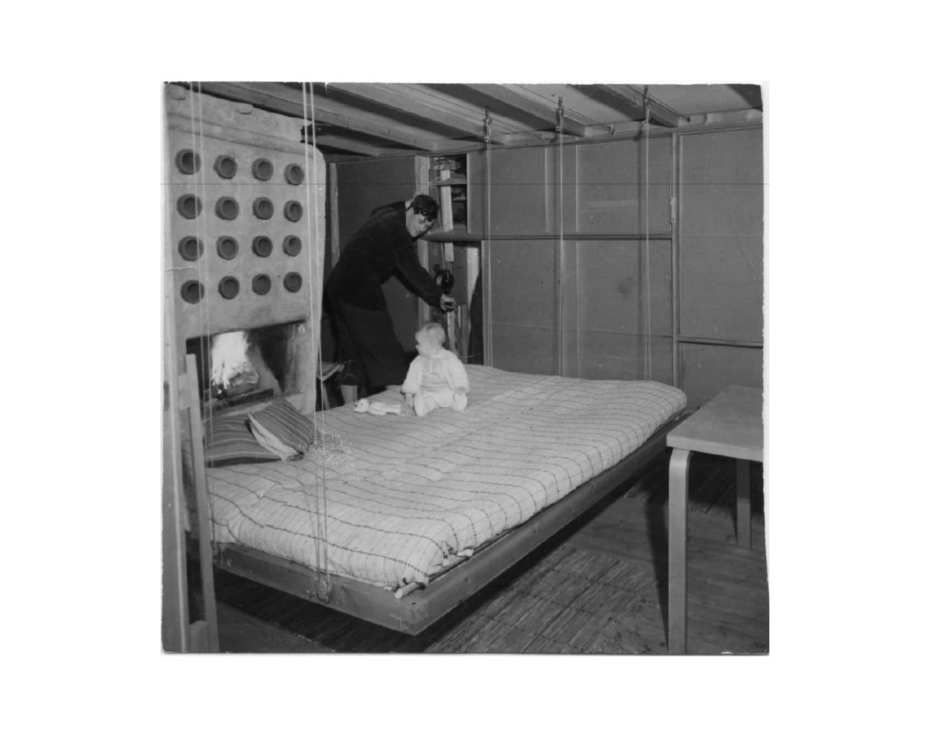 In Ralph Erskine’s cabin in Lissma, a suspended piece of furniture lowers at night as a bed, folds during the day as a sofa, and disappears when not needed. The true lo-fi gesture, however, is outside: a simple wood stack that stores logs for winter and strengthens a north-facing wall’s insulation. Necessity turned into resource, scarcity transformed into beauty.