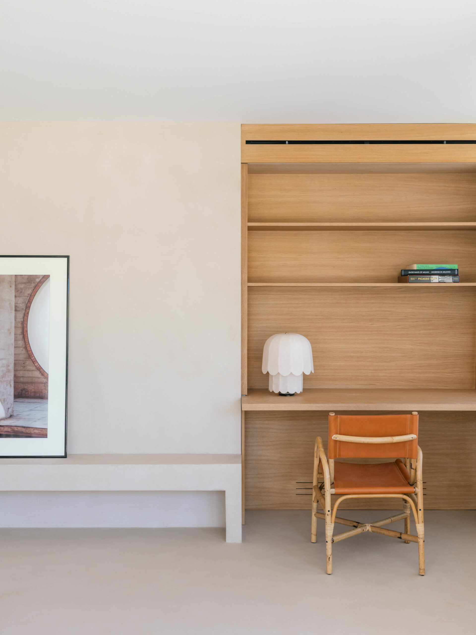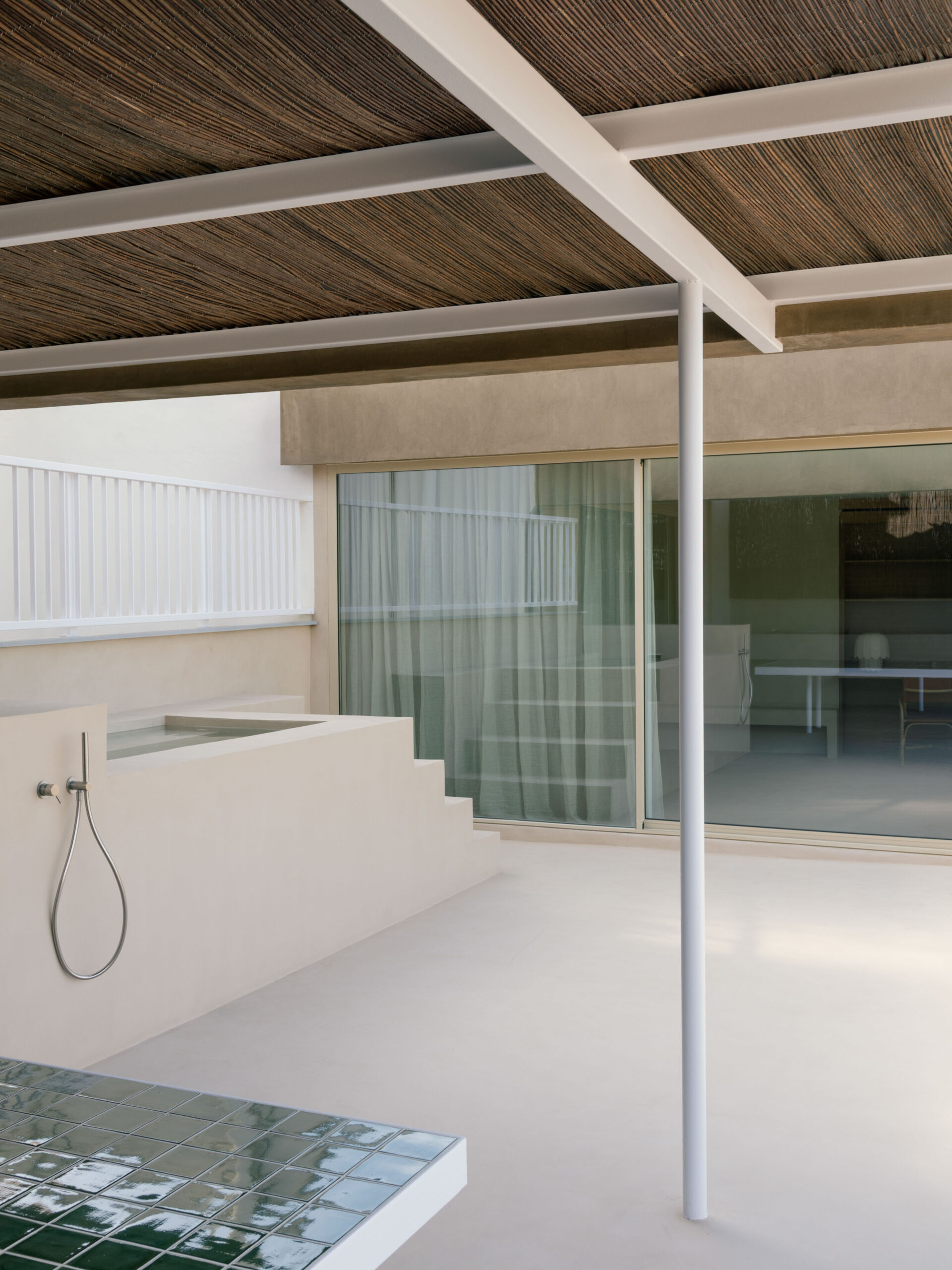 Thanks to a climate that keeps the outdoor areas in use for much of the year, the common areas of the house extend towards the terrace. The kitchen and living room communicate across this central open space through large floor-to-ceiling openings. To reinforce this continuity, materials are repeated inside and out: warm, tactile, and coherent, creating a soft and unified atmosphere. Outside, a pergola supporting solar panels provides shade for an outdoor kitchen and a large built-in table finished with local green tiles. A small pool completes the exterior area, adding to the Mediterranean spirit that links the entire design.