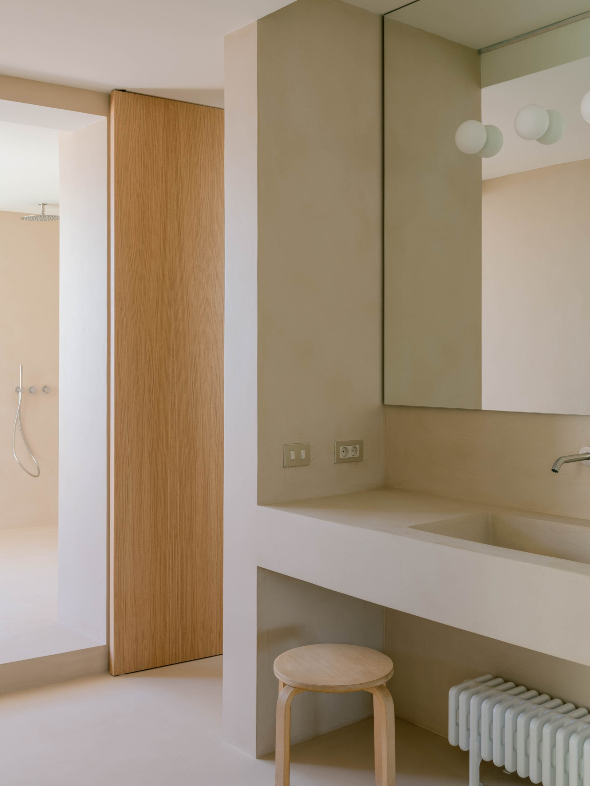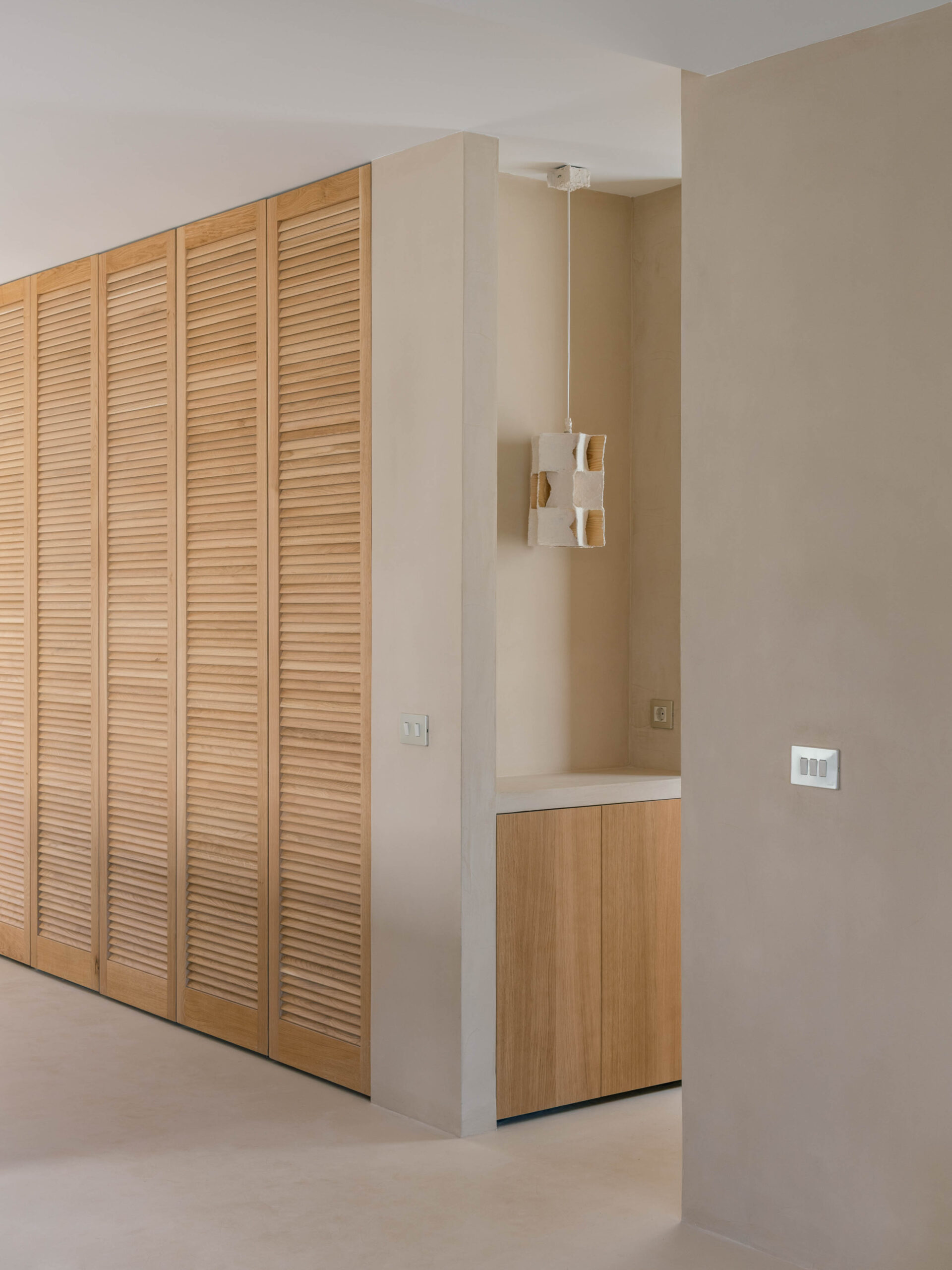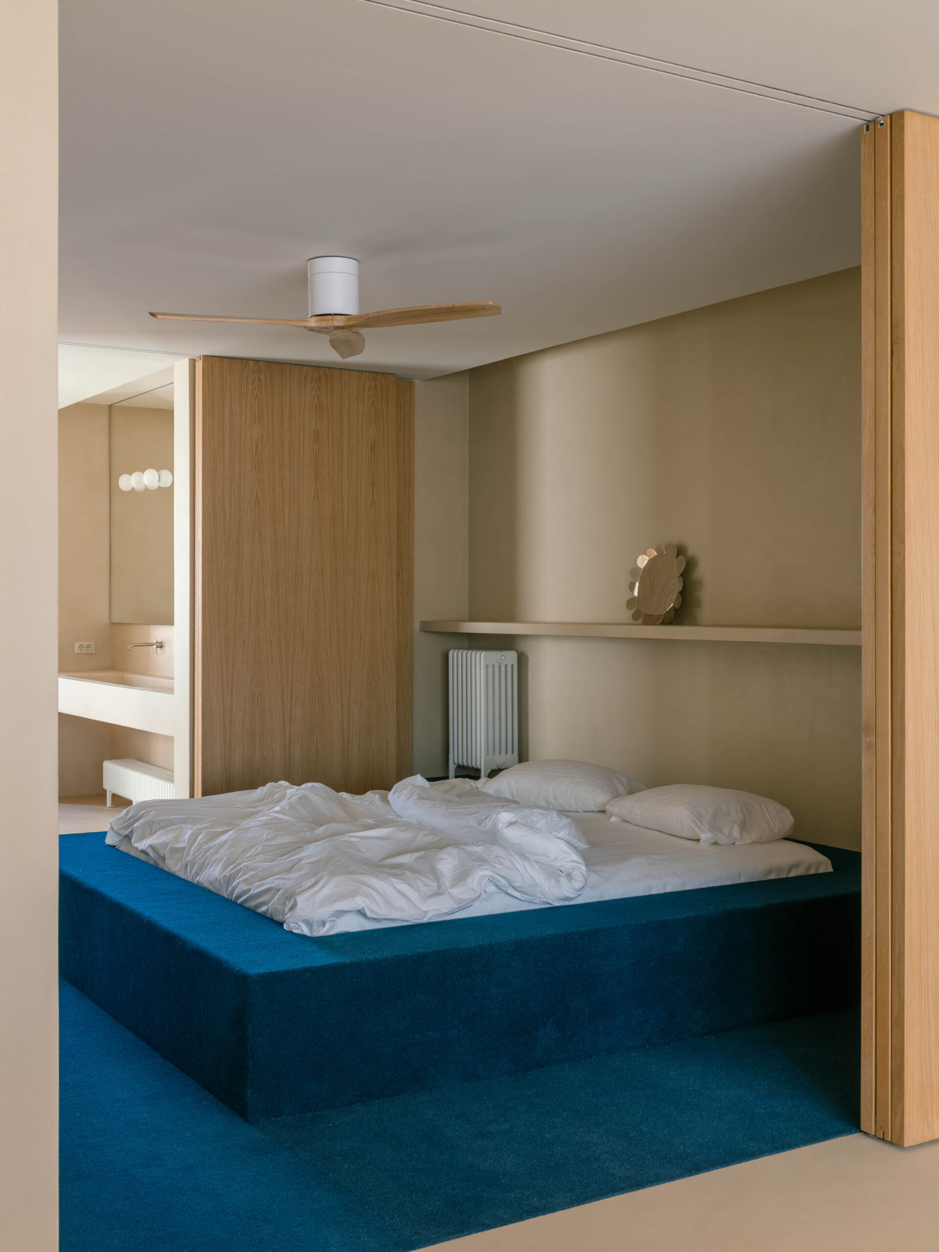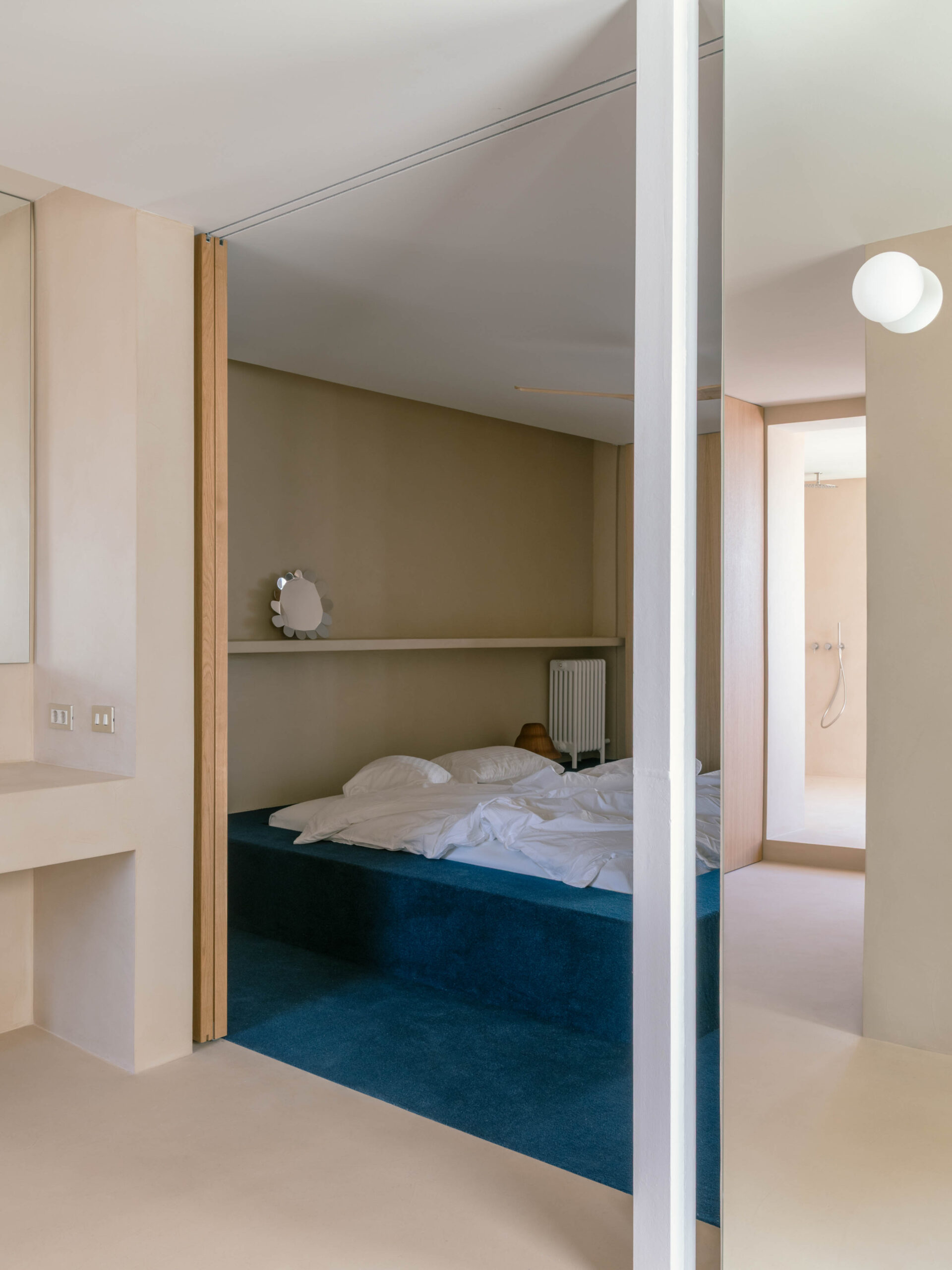 The floorplan is organised along a north–south axis: the bedrooms and bathrooms sit to the east, while the kitchen, dining area, and living room open onto the large west-facing terrace and the views. The main bedroom is conceived as a minimal and flexible unit, defined by wood sliding panels at both ends that connect the space either to the living area or to the bathroom and dressing area, which form a single open space.