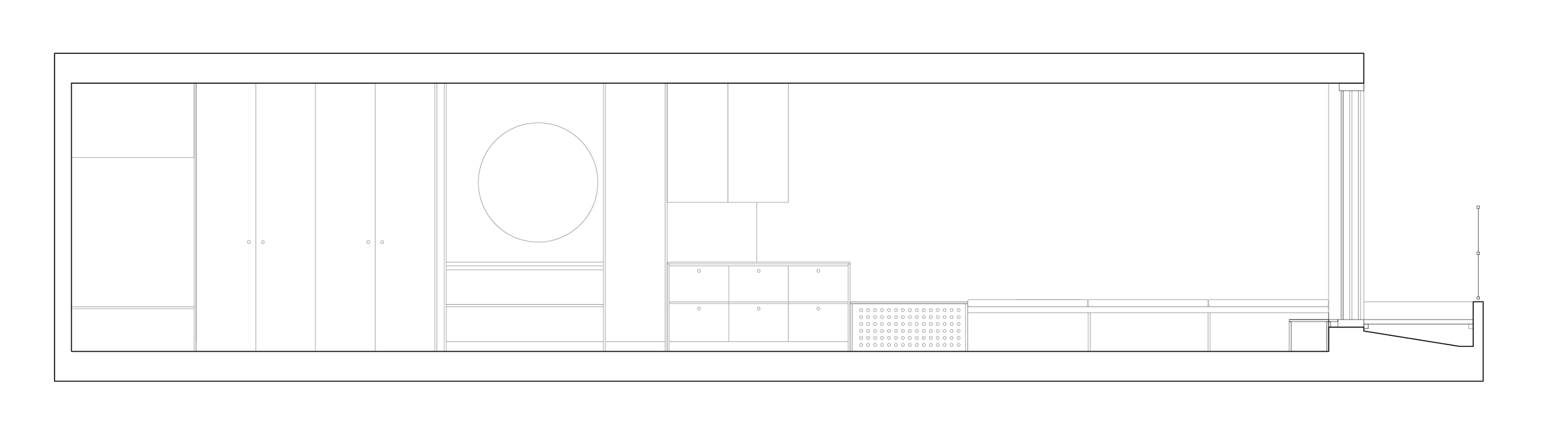 We reimagined the hallway as a multifunctional space, integrating storage solutions and practical features. A custom-built 60 cm deep unit along the neighbor’s wall serves multiple functions, from a cupboard to a kitchen counter and dressing table. On the opposite side, a row of shelving subtly separates the private and common spaces, flowing seamlessly into the kitchen and living room.