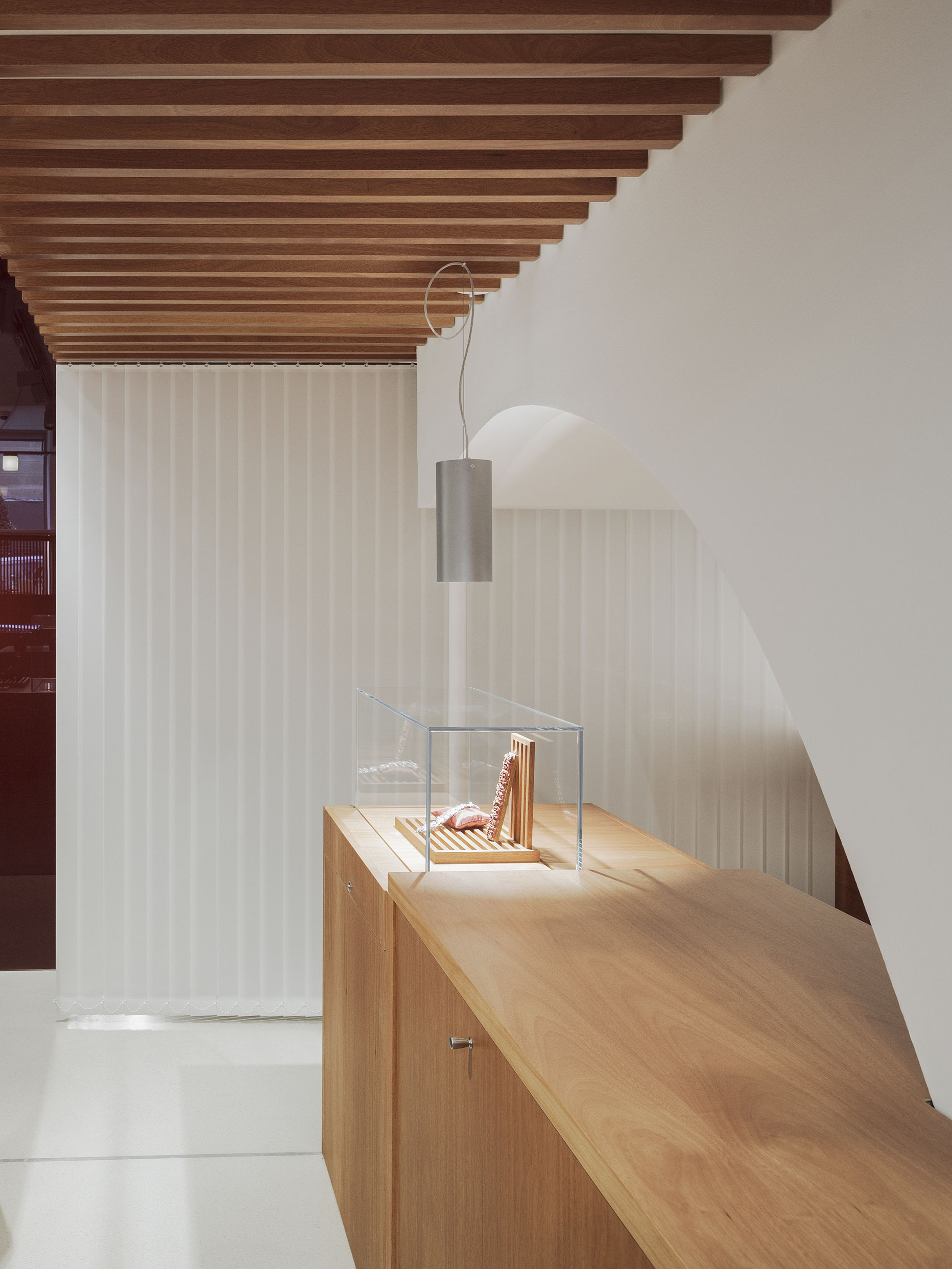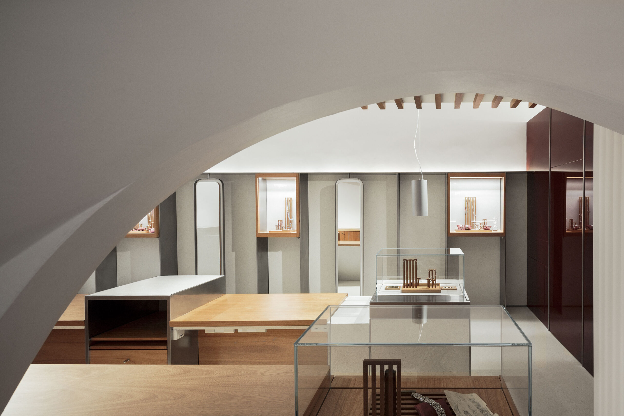 Our work on the heritage-listed façade involved recovering the details and colours that had disappeared over time. We clad the ground floor of the building with Kalahari granite –matching the brand’s colour– framed with a stainless-steel structure that extends into the interior of the jewellery shop. Cast-in-place terrazzo was used for the floor and the main counter, unifying both elements. The warmness of the cedar wood contrasts with the hardness of the stainless steel and terrazzo.