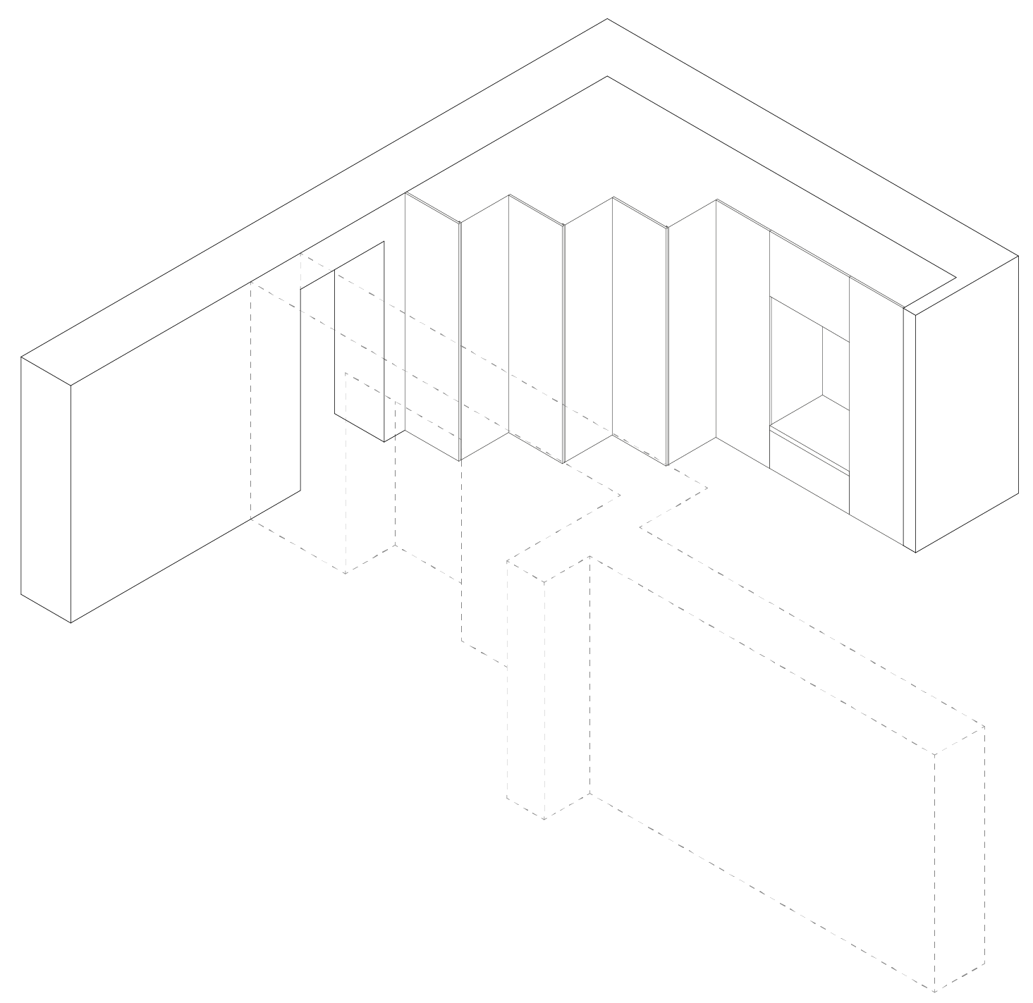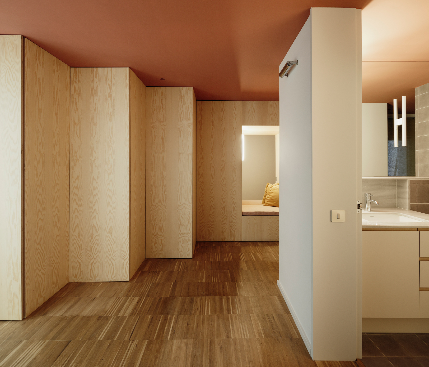 We organized the bathroom and study around the secondary courtyard next to the entrance. The most expressive intervention is at the entrance, where we designed a stair-like storage that takes advantage of the unusual existing corner.